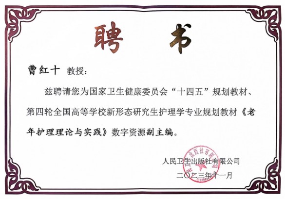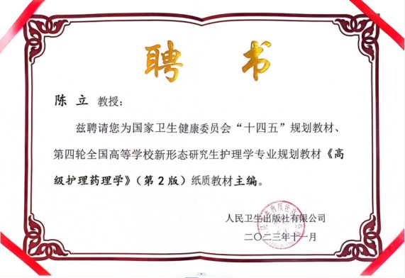 陈立教授被聘为第四轮全国高等学校新形态研究生护理学专业规划教材《高级护理药理学》纸质版第一主编。曹红十副教授被聘为第四轮全国高等学校新形态研究生护理学专业规划教材《老年护理学》数字版副主编。