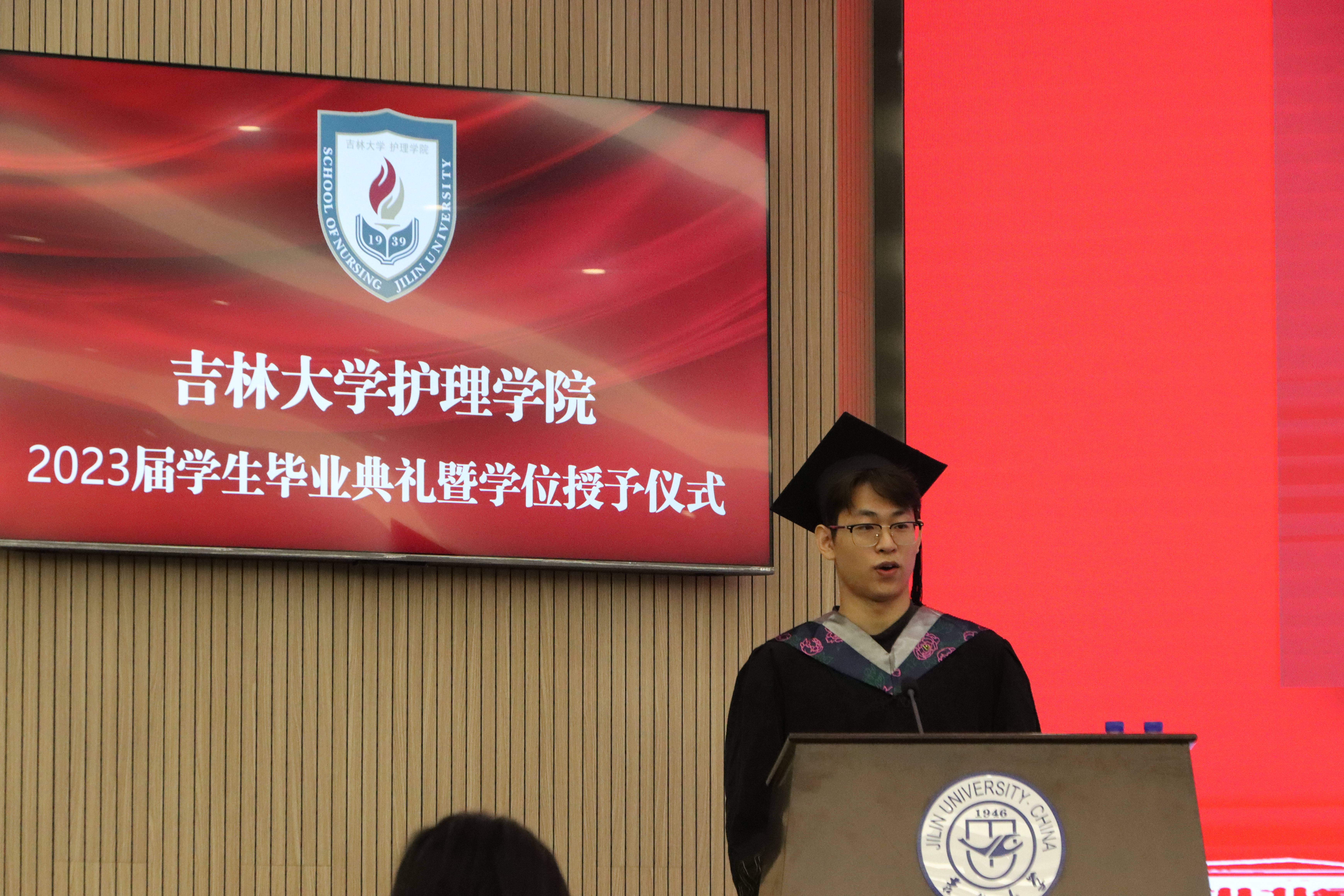 最后,副院长李峰教授致辞。他代表学院向圆满完成学业的毕业生们表示祝贺;向辛勤栽培他们的老师们和抚育他们成长的父母家人们致以崇高的敬意和诚挚的感谢;向在抗击疫情中所有冲锋在前、历经磨砺与成长的志愿者们表示肯定和赞扬。对毕业生提出几点期望。第一,希望同学们终身学习,厚积薄发,永远保持好奇心和求知欲,在不断探索中收获更多的知识和智慧。第二,希望同学们不忘初心,从容致远,牢记白求恩精神和“慎独敦行,仁爱奉献”的院训准则,成为有大爱大德大情怀的护理人和康复人。第三,希望同学们抱负远大,勇攀高峰,树立远大志向,勇敢追求目标,主动把个人发展融入国家复兴大业,争当伟大理想的追梦人。