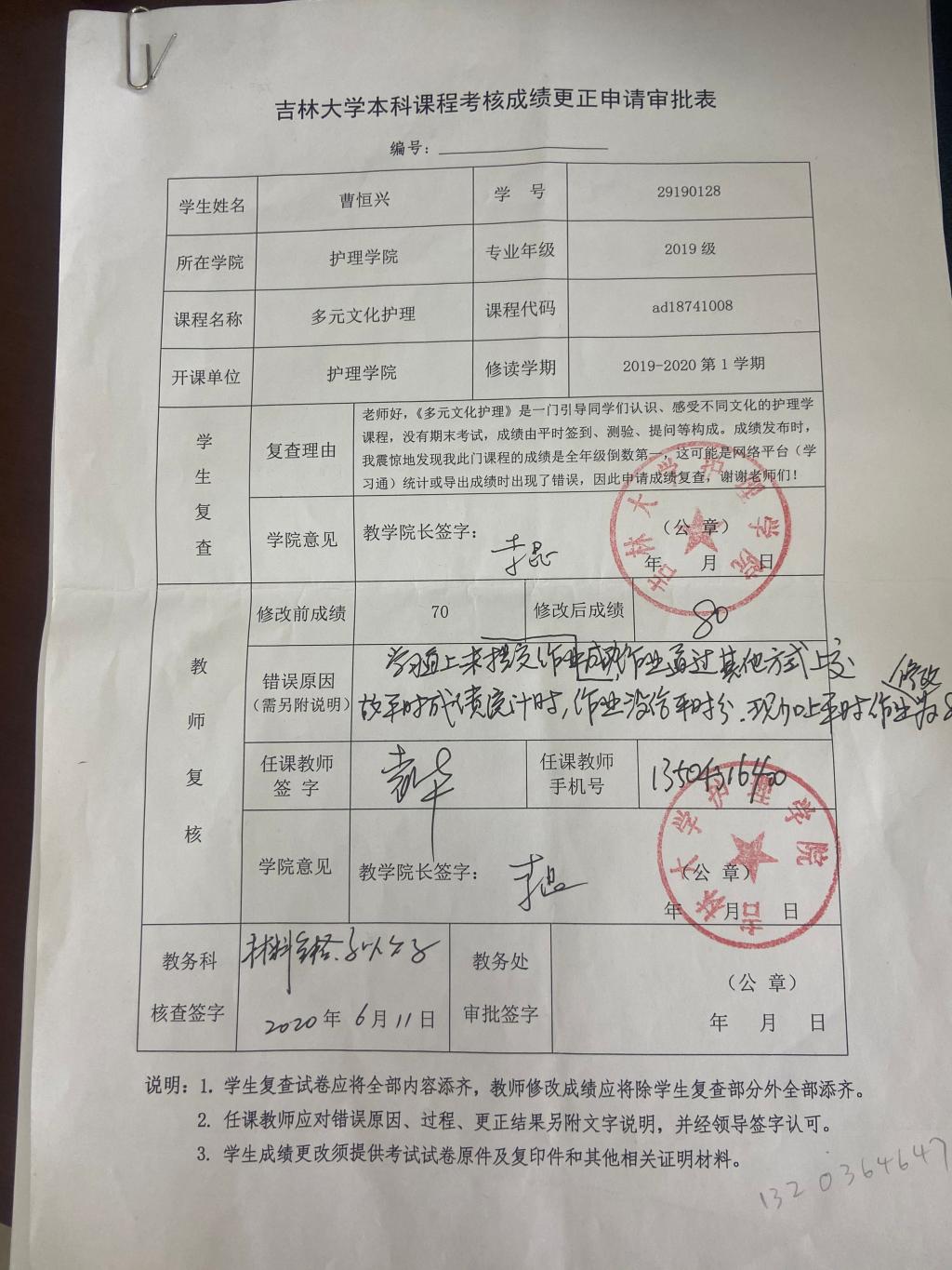 根据《关于进一步明确本科生课程考核等有关问题的通知》(校教字〔2018〕47号)文件有关精神,现对肉番动漫 2019级曹恒兴同学(学号:29190128)2019-2020-1学期课程成绩更正如下: