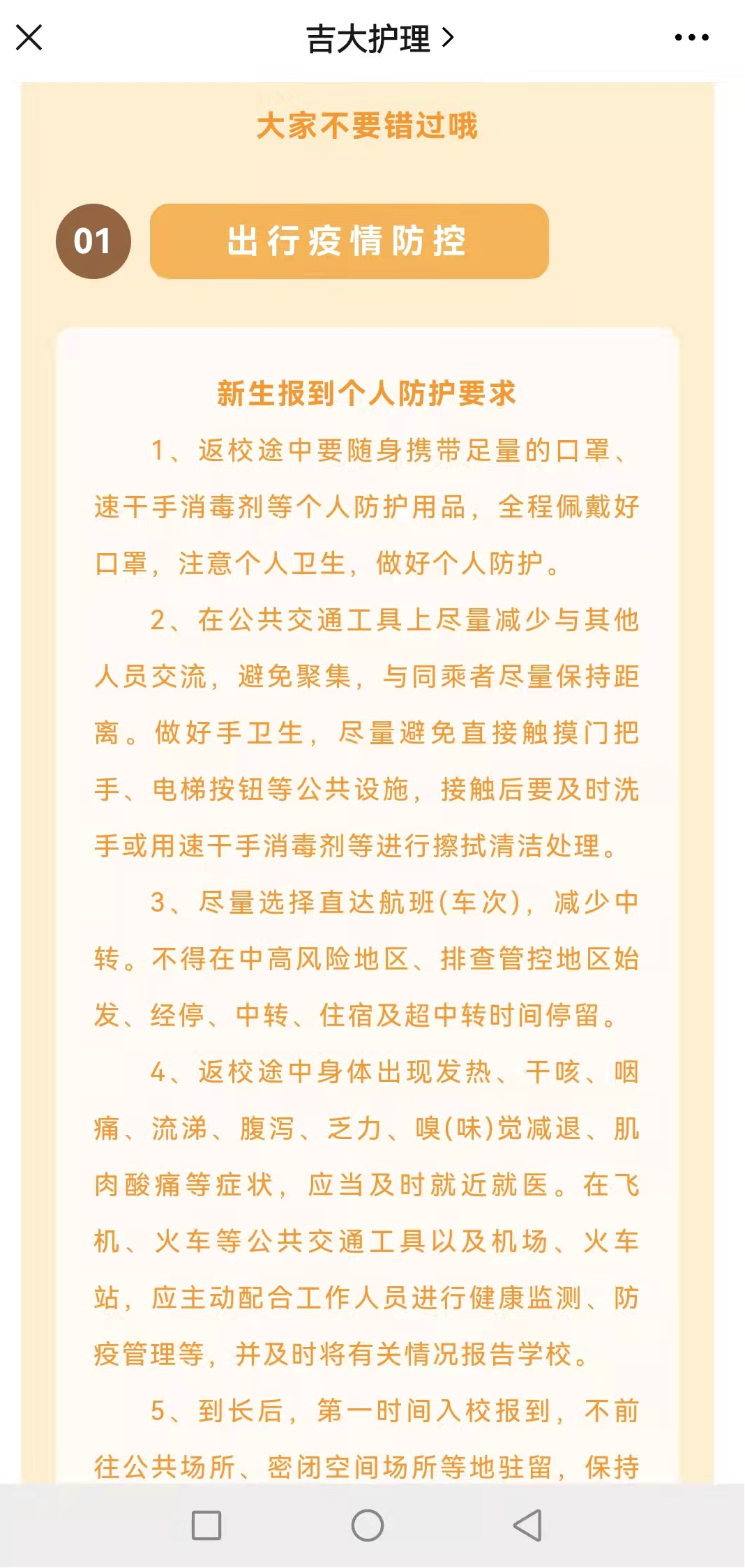 运用新媒体平台开展新生防疫知识宣传和防护指导工作,帮助同学们加强个人防护意识,引导学生正确掌握基本疫情防控措施,确保新生平安来校报到。新生可通过吉大护理公众号新生入学指南系列,全方位了解新生报到的各项准备工作,更加清楚地了解最便捷的报到路线、乘坐校园小巴温馨提示等。除此之外,新生报到的必备材料、报到各项要求也详细地包含在推送中。不仅帮助新生提前做好报到准备工作,还能够帮助新生进一步了解肉番动漫